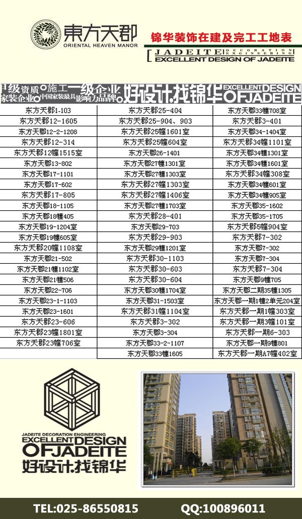 為了更好的讓東方天郡的業(yè)主了解錦華裝飾的整個(gè)工藝流程,錦華裝飾仙林片區(qū)分公司整理了所有東方天郡的完工及在建工地,歡迎大家來(lái)參觀。