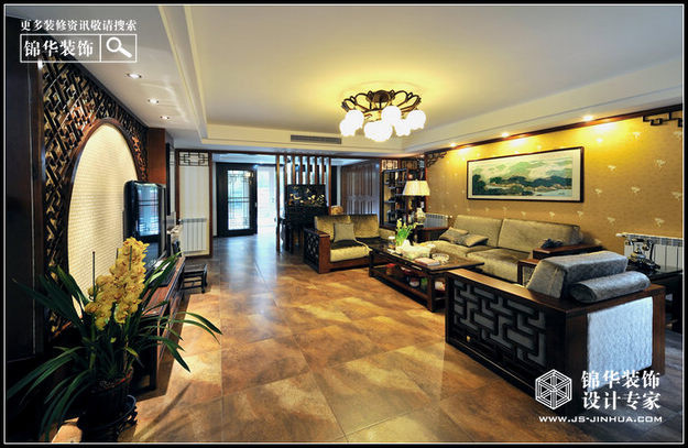 打開家的大門,走過門廳。寬大的客廳布置得典雅、舒適、和諧。以明代家具元素為基礎并按照現代風情改良的紅木茶幾與座椅,與沙發共同勾勒出一個充滿中國文化情調,但又不失時代氣息的親情空間。