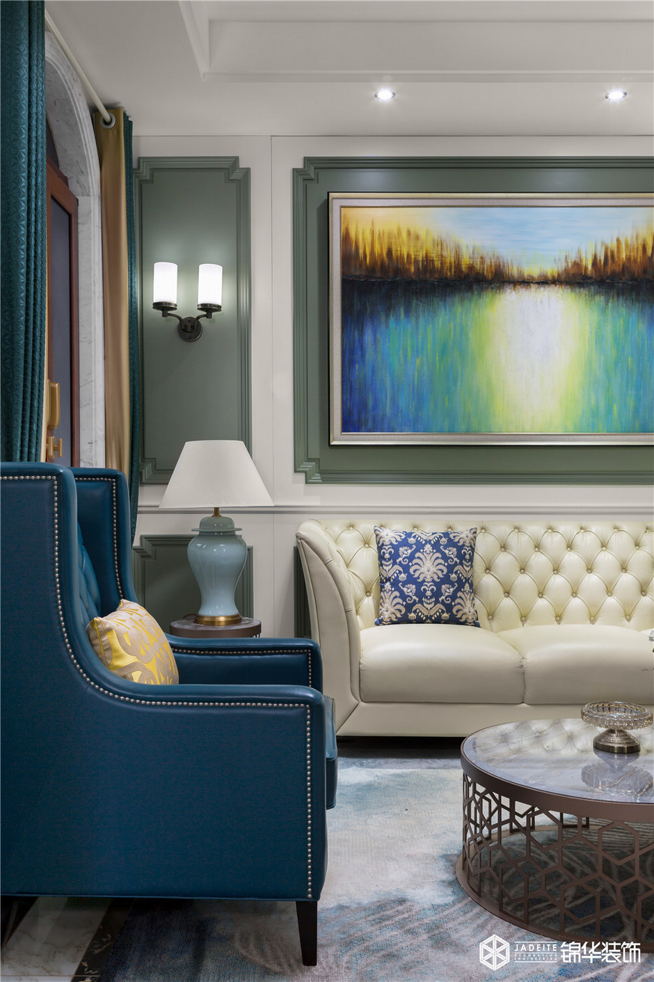 空間內,所有的顏色都是相輔相成的。墻面做了一個基礎色,里面隱含了一點綠、一點藍,與旁邊的窗簾起到一個呼應的作用。窗簾選用藍色和淺灰相搭配,與整體空間和諧地融為一體。