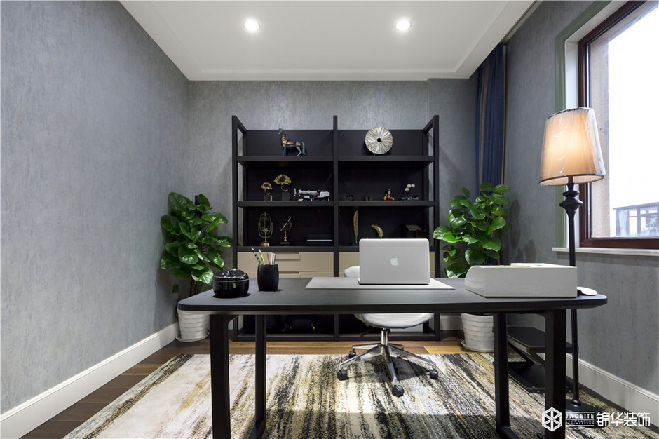 書房的主要功能是滿足業主工作需求,所以整體設計以簡約穩重為主。書架上的飾品都是業主的心愛之物,墻角的綠植讓空間更具自然活潑氣息!